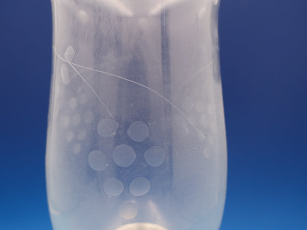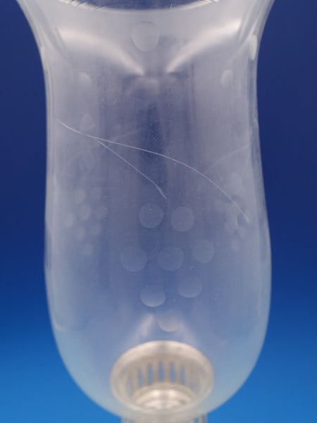 Gorgeous Woodward and Lothrop sterling silver and glass hurricane lamp candlestick pair marked #47. The hurricane lamps feature beautifully etched grapes on the glass shade. The pieces measure 12" tall x 4 1/2" and are weighted. They are not monogrammed and are in good estate condition as shown in the photos. Exceptional!