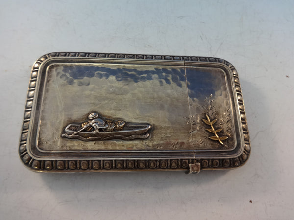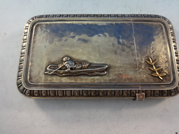 figure with sword, applied silver Japanesque figure in boat, and applied gold