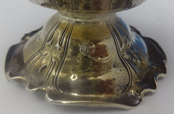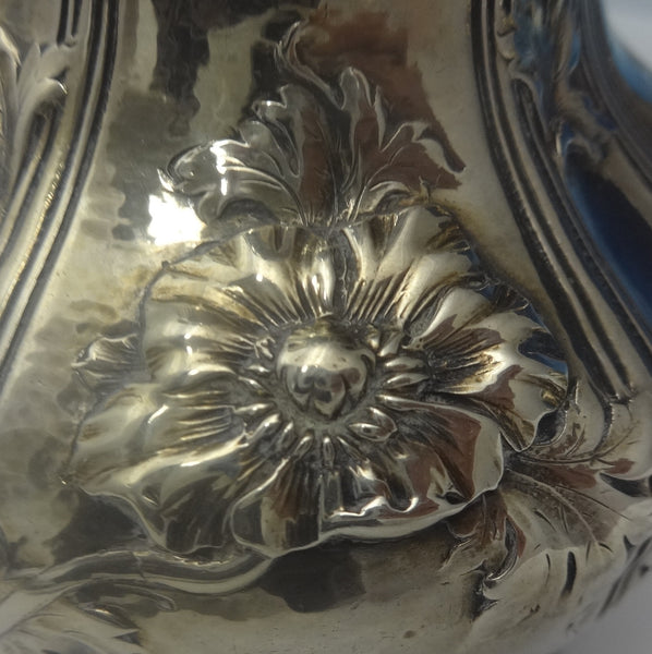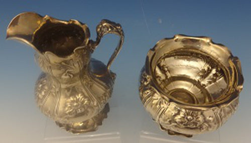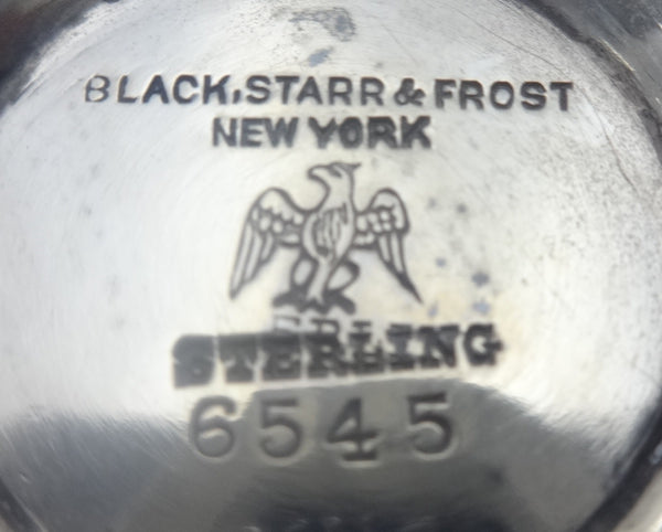 Very fine Martele style sterling silver sugar and creamer set made by Black, Starr Frost. It features hammered and chased floral design. Marked #6545. Creamer measures 6" high, 4" wide, weighing 14.9 ozt. The sugar measures 4" tall, 4" wide, and weighs 12.0 ozt. This set dates from 1890-1900. The pieces are not monogrammed and are in excellent condition. Impressive! SKU#0306.