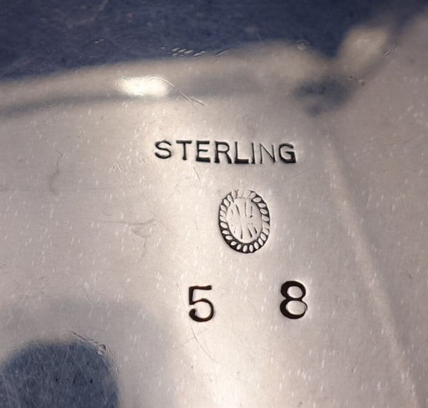 Blossom by William L. deMatteo sterling silver Bowl with 3 applied modernist feet, that dates from the 1940s, stamped #58. It measures 6 1/8" in diameter x 3 3/8" tall, and it weighs 10 ozt. It is monogrammed, as shown, and is in good vintage condition.