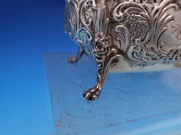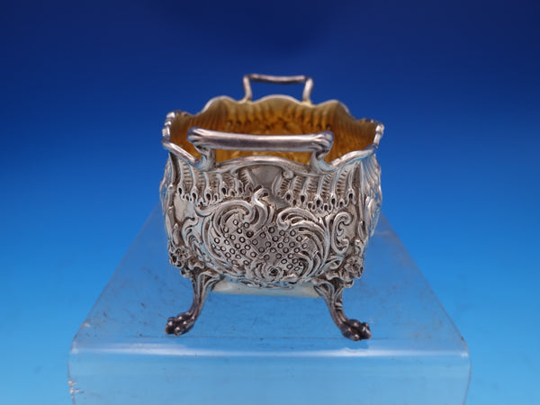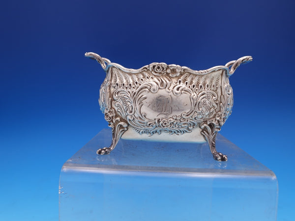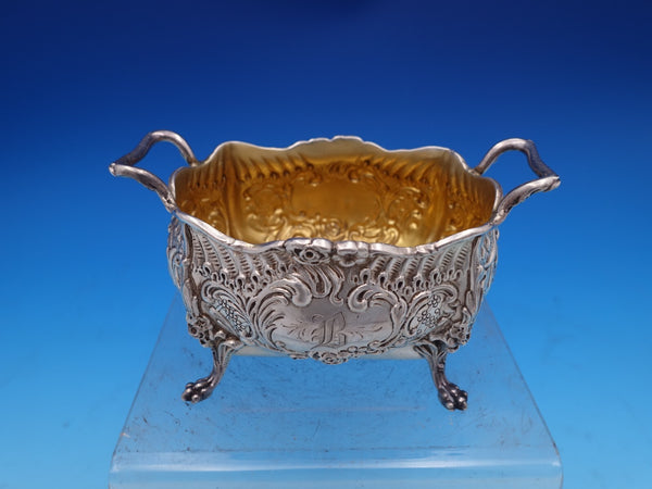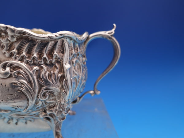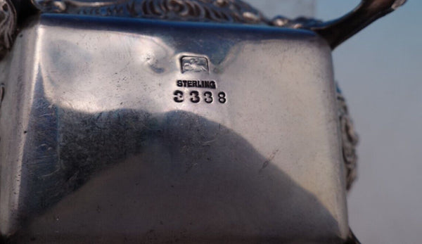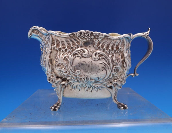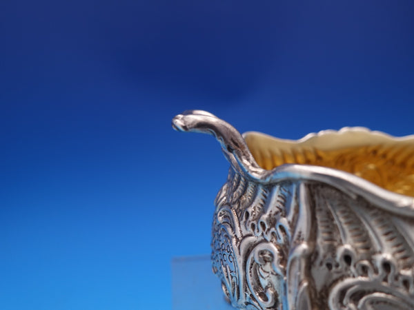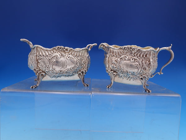Gorgeous Dresden by Whiting sterling silver Sugar Bowl and Creamer with gold-washed interiors, marked #3338. The sugar bowl measures 4 3/4" L x 3 1/2" tall and the creamer measures 4 1/2" L x 2 1/2" tall. They weigh 10.2 troy ounces total. They are monogrammed "B" in the centers and are in good estate condition as shown in the photos. Beautiful!