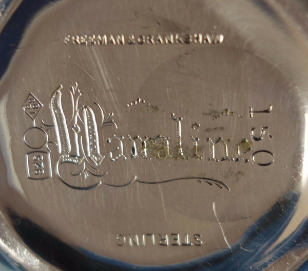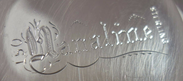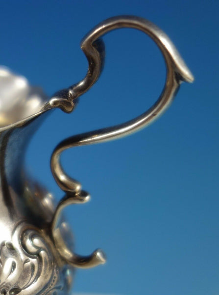 Dominick Haff sterling silver sugar and creamer set #150 with beautifully repoussed flowers and scrollwork. This set is dated 1889 and has a total weight of 7.22 troy ounces. This sugar measures 3" tall x 5" wide. The creamer measures 3 1/2" tall and 3 1/2" . This set has an inscription on the bottom (see photos), and is in excellent condition. Absolutely gorgeous!