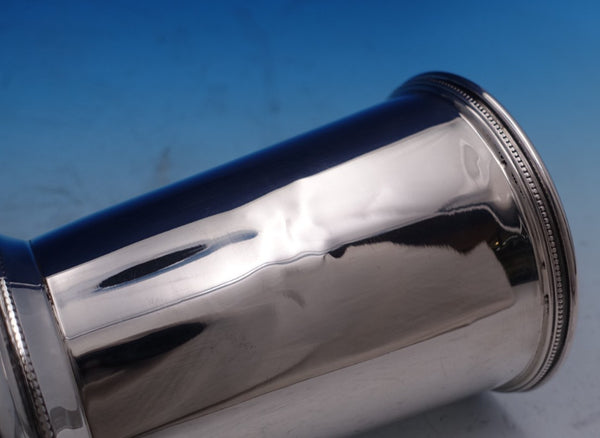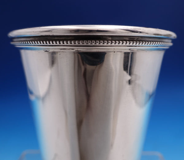 Wonderful colonial reproduction sterling silver mint julep cup marked #973 (maker unknown). This piece features a beautiful beaded border at the top and bottom. It measures 4 3/4" tall x 3 1/4" and weighs 7 troy ounces. It is not monogrammed. It is being offered as-is due to some dings and dents as shown. Terrific piece!