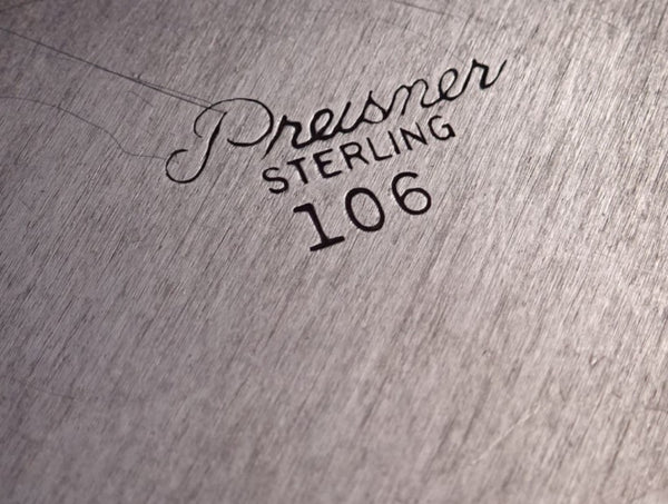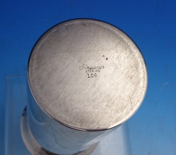 Preisner sterling silver Tumbler Dinking Cup marked #106. This cup measures 5 1/8" tall x 3" wide at rim and weighs 4.4 troy ounces. It is not monogrammed and is in good vintage condition with some minor dings.