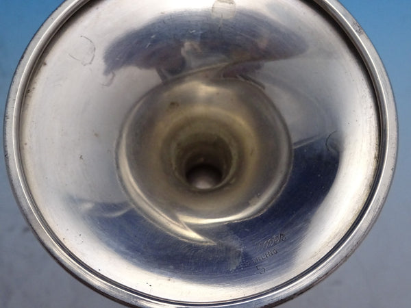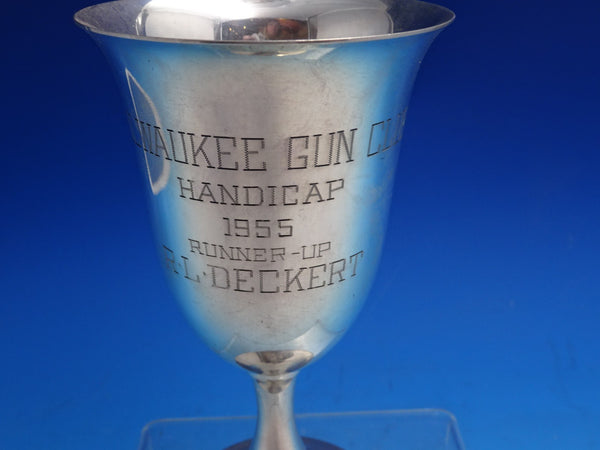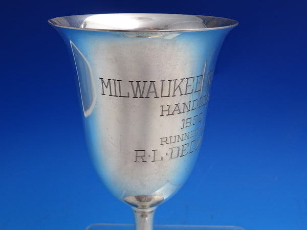 Preisner sterling silver Water Goblet marked #5. It measures 6 3/8" tall x 3 1/4" diam. at rim and weighs 3.67 troy ounces. It is monogrammed with an inscription for the Milwaukee Gun Club and is in good vintage condition with some minor dings.