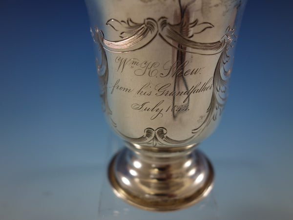 Antique Tifft Whiting coin silver Child's Cup footed with brite-cut shield and scroll work. This item is dated 7-1853. The measurement for this piece is 3 3/8" x 2 5/8", and it weighs 2.64 ozt. It is monogrammed (see photo) and is in As-Is condition, with some small dings.