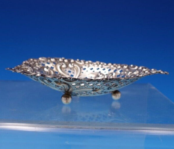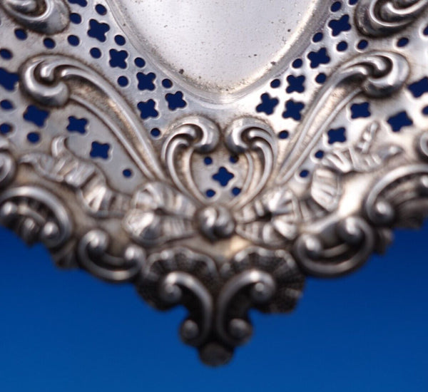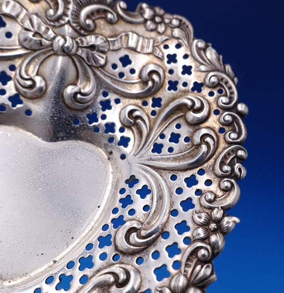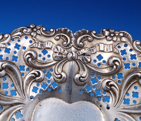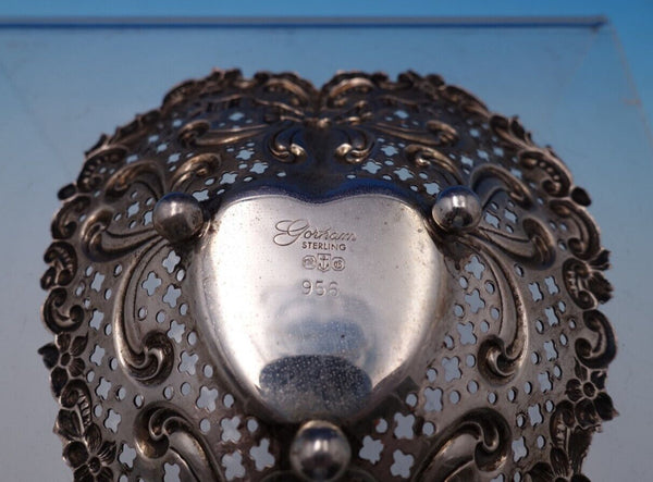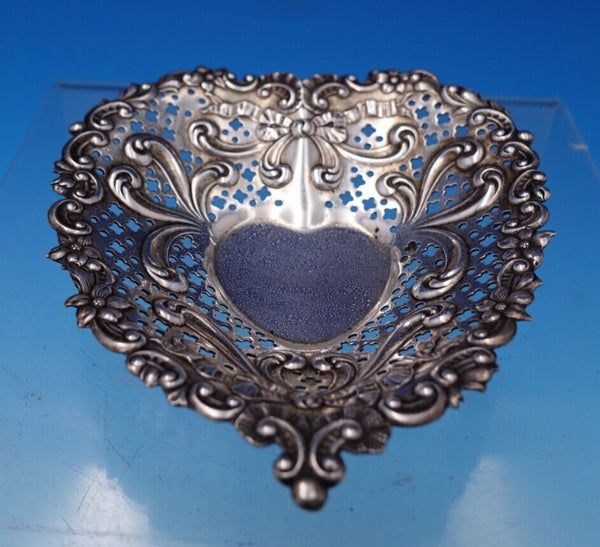 Lovely Chantilly by Gorham sterling silver heart-shaped nut dish marked #956. This piece measures 1/4" tall x 3 3/4" and weighs 0.9 troy ounces. It is not monogrammed and is in good estate condition. Pretty!