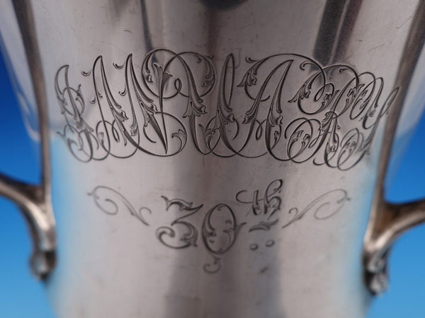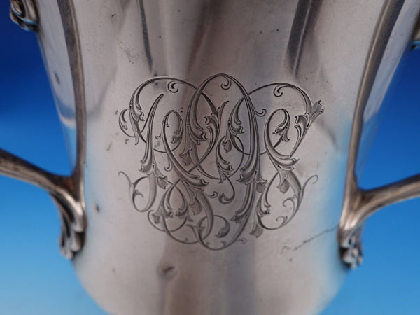 Beautiful Dominick and Haff sterling silver three-handle champagne cooler or loving cup with gadroon design, stamped #742, circa 1870. It measures 8 3/8" tall x 9" (to handles) and weighs a heavy 48.5 troy ounces.
