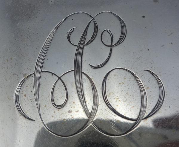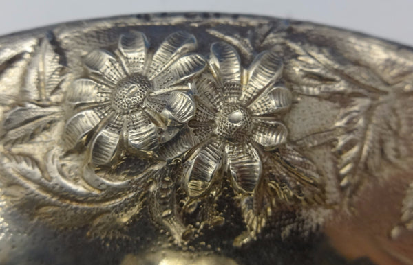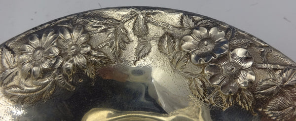 Repousse by Kirk sterling silver candy dish that has a "CC" monogram. It's also marked with #14 and 925/1000. The dish dates from 1925-32, and it measures 1 1/4" tall, 7" in diameter, and weighs 6.1 ozt. It is in excellent condition.
