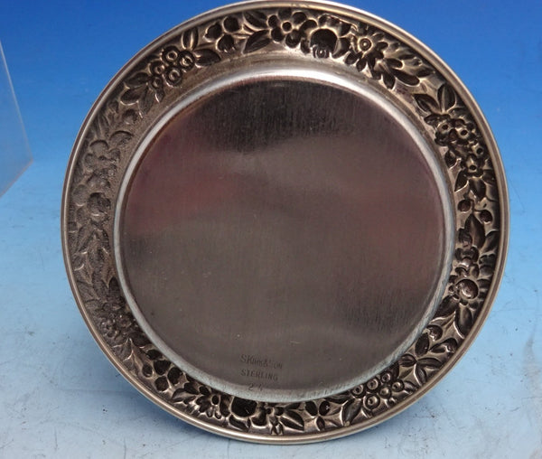 Repousse by Kirk sterling silver coaster marked #24. This coaster measures 4 1/8" in diameter and weighs 1.8 troy ounces. It is not monogrammed and is in good vintage condition, as shown in the photos. We will polish prior to