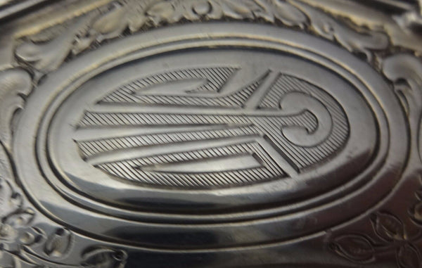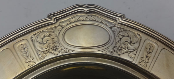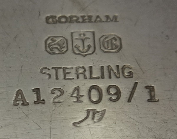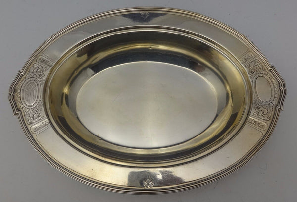 Elegant Saint Dunstan Chased by Gorham sterling silver vegetable dish. It has a Deco style "R" monogram, is marked with #A12409/1, and is hallmarked for 1925. It measures 2" tall, 11" x 8", and weighs 12.8 ozt. It is in excellent condition. Exquisite! SKU#0615.