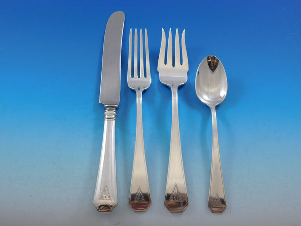 Monumental Art Deco "Number Nineteen" by Durgin, c1916-1952, sterling silver Flatware set, 212 pieces. This set includes:12 Dinner Size Knives, 9 3/4"12 Dinner Size Forks, 7 7/8"12 Regular Knives, 8 3/4"12 Regular Forks, 7"11 Teaspoons, 6 1/8"12 Place Soup Spoons, 7 1/8"12 Flat Handle Butter Spreaders, 6"12 Cocktail Forks, 5 5/8"12 Bouillon Soup Spoons, 5 5/8"12 Demitasse Spoons, 4 1/4"12 Ice Cream Forks, original, 5 5/8"11 Dessert Forks, 6 1/4"12 Dessert Knives, 7 3/4"12 Gumbo Soup Spoons, 6 3/4"12 Grapefruit Spoons, 6"12 Fish Knives, flat handle all-sterling, 8 1/4"12 Fish Forks, 7 1/8"1 Gravy Ladle, 7 1/4"2 Cold Meat Fork, splayed, 8 5/8"1 Sauce Ladle, 5 3/4"1 Salad Serving Set, hollow handle, 10"1 Cheese Server w/stainless blade, 6 3/4"1 Cake Server w/stainless blade, 10"1 Vegetable Serving Spoon, 9"1 Sugar Tong, 5"Includes BONUS large vintage 2-drawer flatware storage chest.