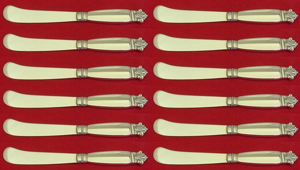 Set of 12 sterling silver hollow handle, all silver Butter Spreaders with stainless paddle blades, 6", in the pattern Acanthus by George Jensen. They are not monogrammed and are in excellent condition.