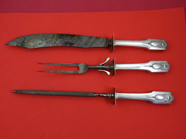 Sterling silver Roast Carving Set 3-piece, Knife 14 1/2", fork 11 1/2", hone 14" in the pattern Adam by Shreve. It is not monogrammed and is in as-is condition with wear to the steel implements, as shown.