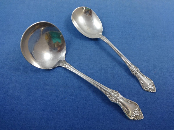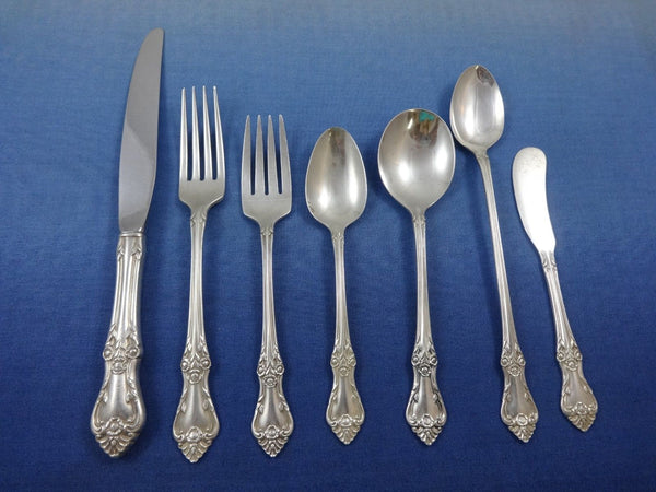 8 KNIVES, 8 3/4" 8 FORKS, 7 1/8" 8 SALAD FORKS, 6 7/8" 8 TEASPOONS, 6" 8 CREAM SOUP SPOONS, 7 1/2" 8 FLAT HANDLE BUTTER SPREADERS, 5 3/4" 8 ICED TEA SPOONS, 7 1/2" 1 GRAVY LADLE, 6 3/8" 1 SERVING SPOON, 8 1/8" 1 COLD MEAT FORK, 8" 1 SUGAR SPOON, 6" Includes bonus brand new storage chest - styles vary.