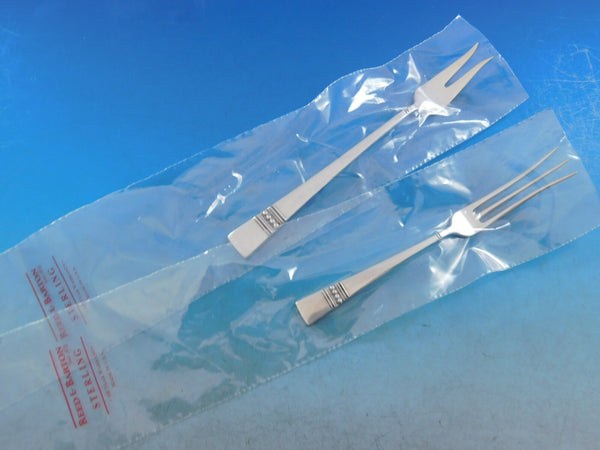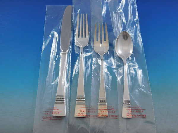 Unused Mid-Century Modern "Diadem by Reed Barton" sterling silver Flatware set, 75 pieces. In the year 1967, famed Reed Barton designer John Prip's Diadem pattern was introduced, accented with a band of the most traditional silver ornamentation, beading, but used in a new unique way. This set includes:
