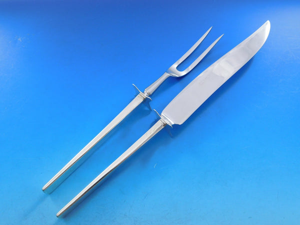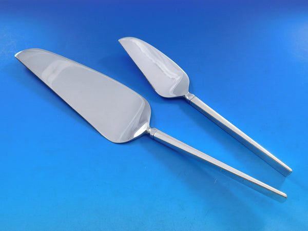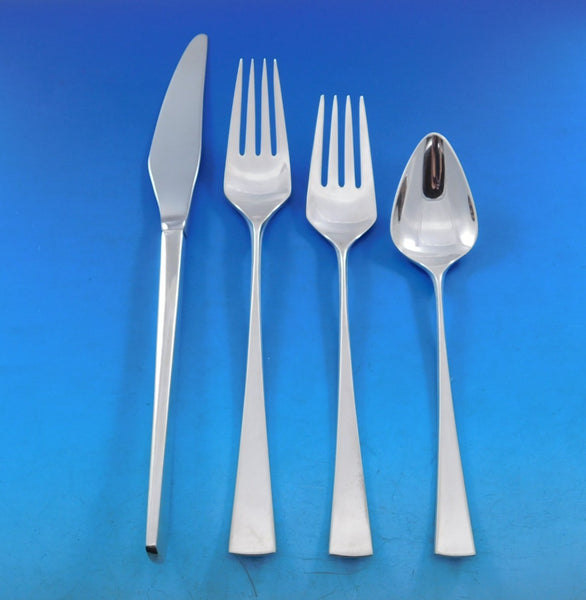 Innovative Mid-Century Modern, circa 1961, sterling silver set designed by Ronald Prip for Reed Barton. The pattern is included in the collection of The Dallas Museum of Art and is prominently featured in Jewel Sterns important book "Modernism in American Silver - 20th Century Design."This pattern has an elongated linear quality with a sharp profile. The unique handle of the knife is turned 90 degrees.