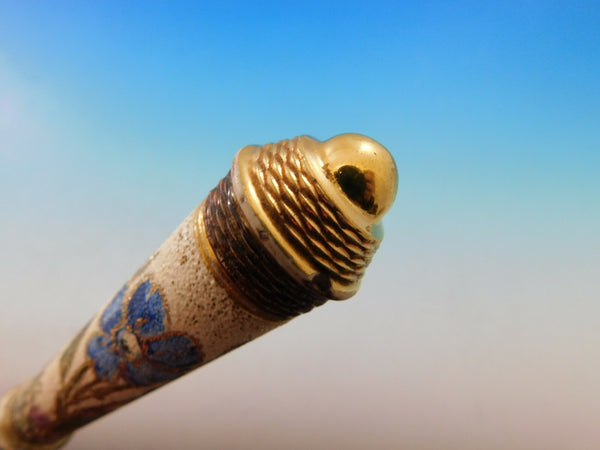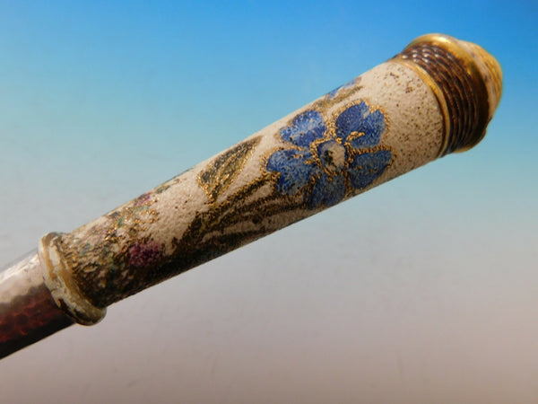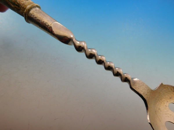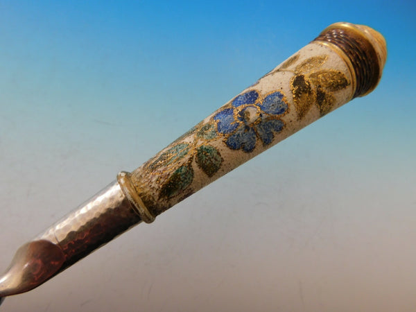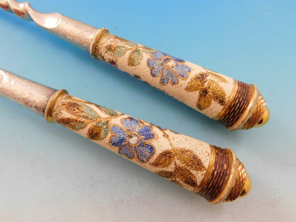 Incredible sterling silver Salad Serving Set, 2-piece, measuring 11" in pattern Doulton by Shreve. These pieces have hammered sterling silver serving areas with a stunning twist as it goes down the handle. The very unique handle end is porcelain with gilt enamel. The floral design appears to be hand painted on with a glitter coat on top. It is not monogrammed and is in excellent condition.