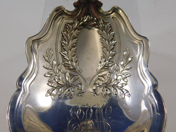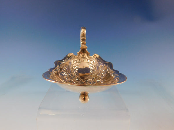 Unique sterling silver CANDY DISH WITH HANDLE and ball feet, 4" X 3" in the pattern DUBARRY BY DURGIN, circa 1901. It is monogrammed (EBW in the bowl) and is in excellent condition.