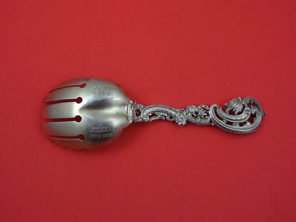 Antique sterling silver Vegetable Serving Fork, gold washed 9" in the pattern Du Barry Pierced by Durgin. It is monogrammed (monos vary) and is in excellent condition. The die struck handle incorporates an intricate, asymmetrical, rococo, ornate, pierced design.