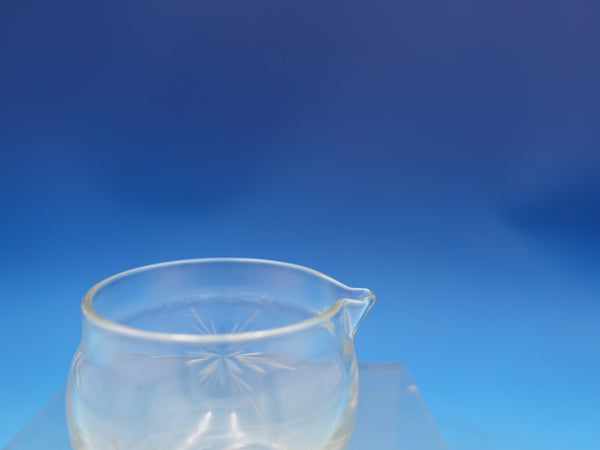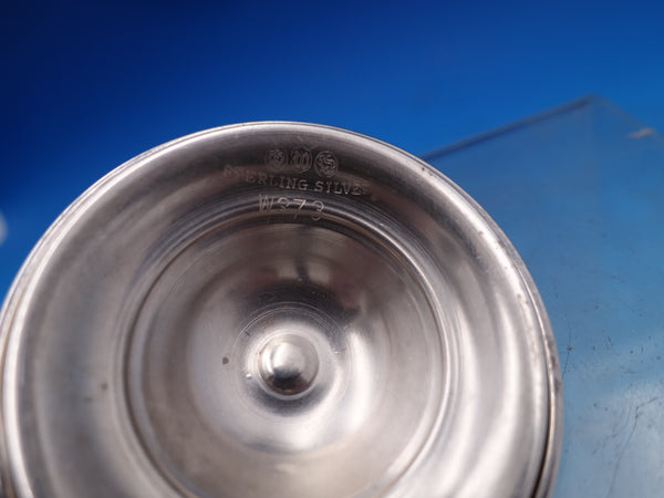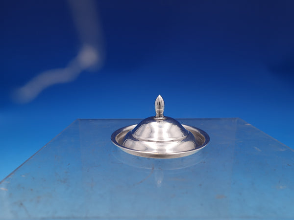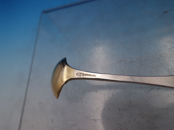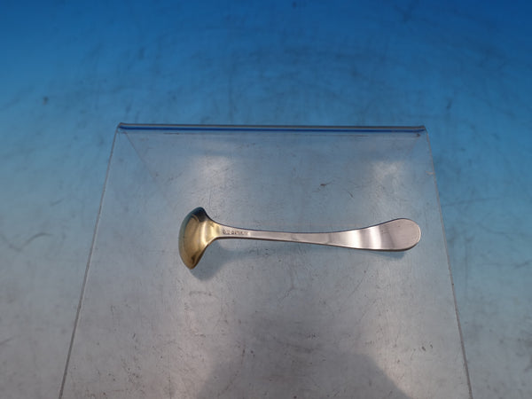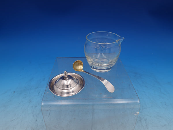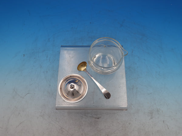 Etiquette by Watson glass Mustard pot with sterling silver lid and sterling silver mustard ladle with gold-washed bowl. The jar is stamped W373, measures 3 1/4"