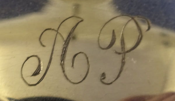Lovely Gadroon by Webster sterling silver mustard pot with beautiful cobalt blue glass insert and spoon. The mustard pot measures 2" tall x 4" and weighs 3.8 troy ounces. The pot and spoon are monogrammed (see photos), and are in excellent condition. Wonderful!