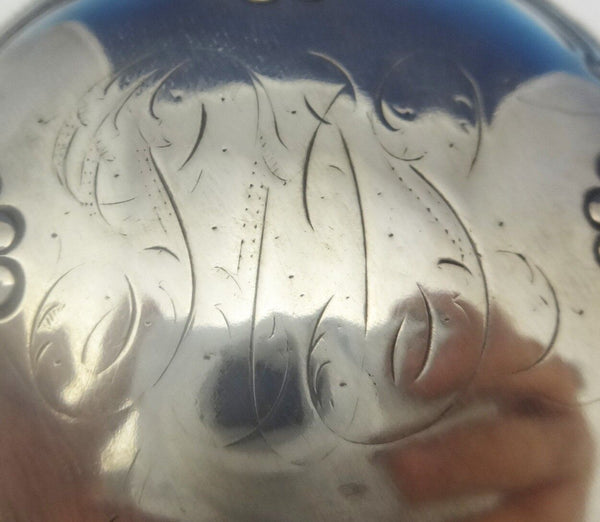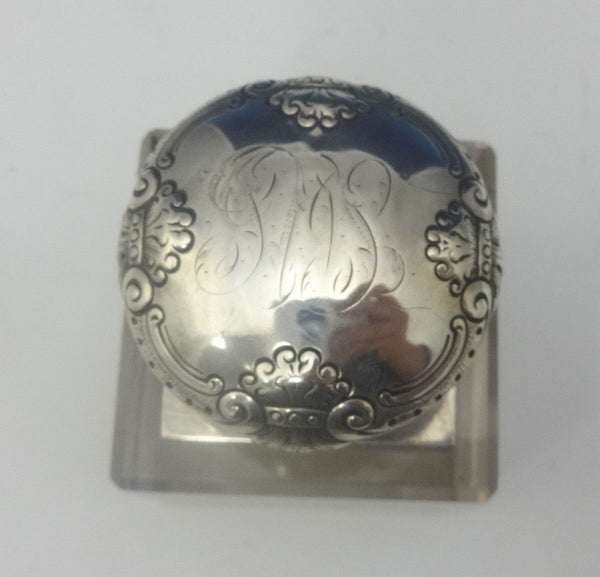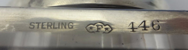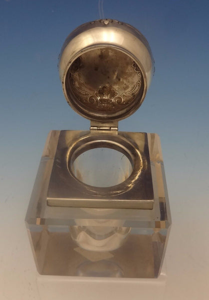 This fabulous inkwell was made by Ferd Fuchs Bros. of New York c1884-1891. The piece is made of crystal with a sterling silver top and it's marked with #446. It has a vintage light monogram (see photo). The measurements for the inkwell are 4" tall and 3" wide. It is in excellent condition. Fabulous! SKU#0381.