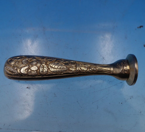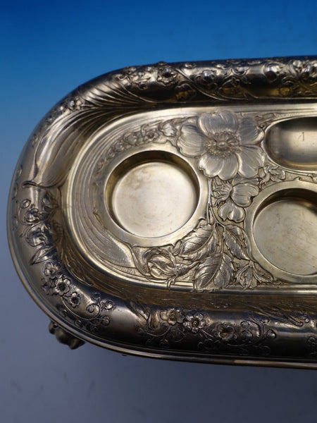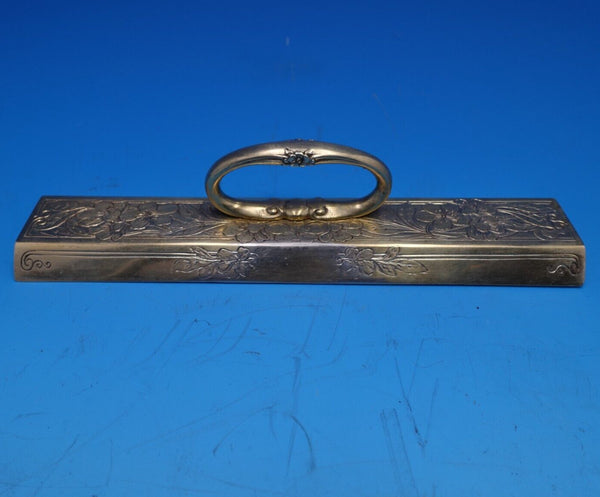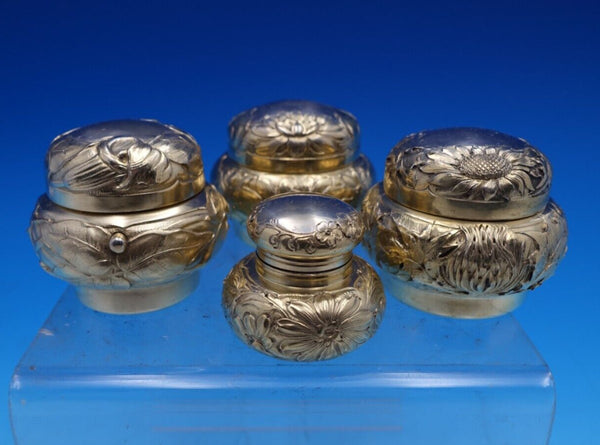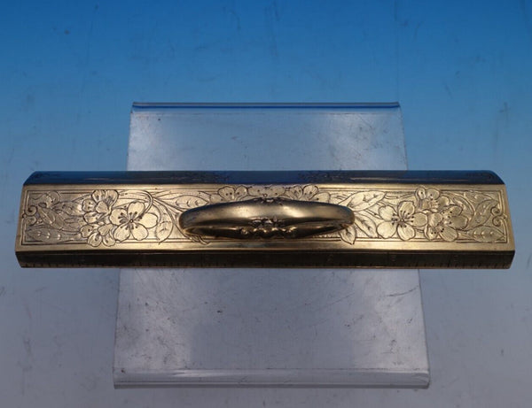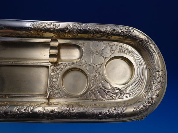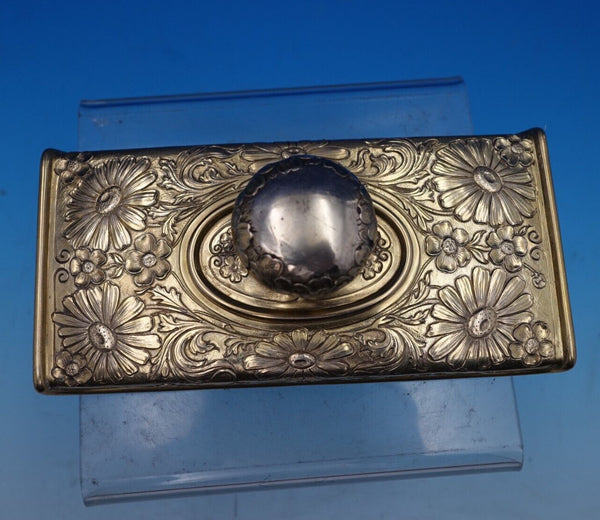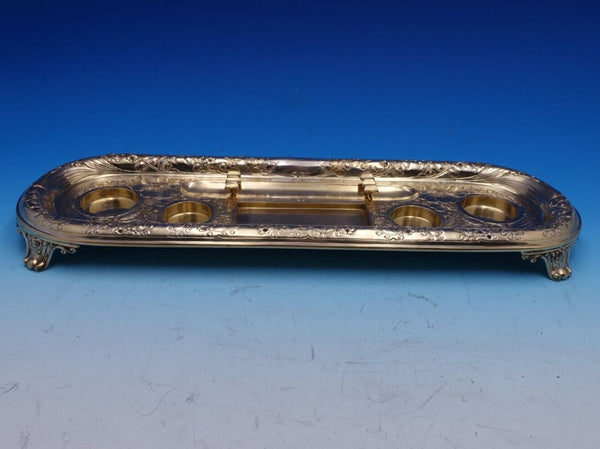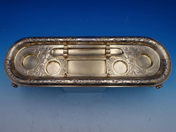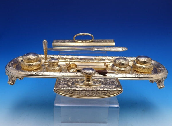 Exceptional Floral by Gorham sterling silver twelve-piece vermeil desk set featuring motif of daisies, lily of the valley, iris, forget-me-nots, violets, and other flowers. Completely gold washed. This set has a Gorham key mark for 1906 and includes: