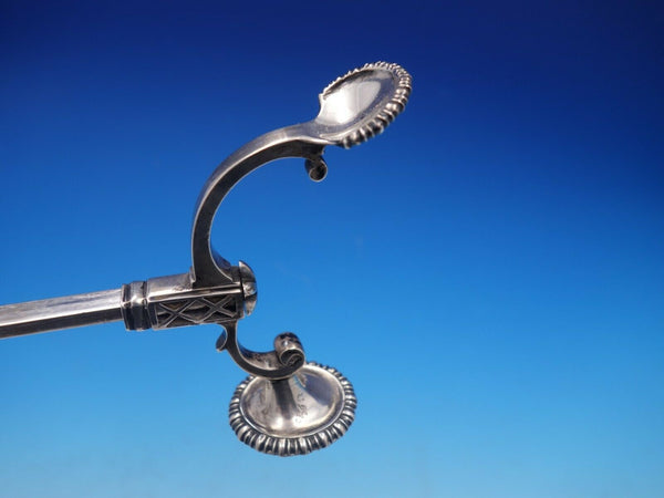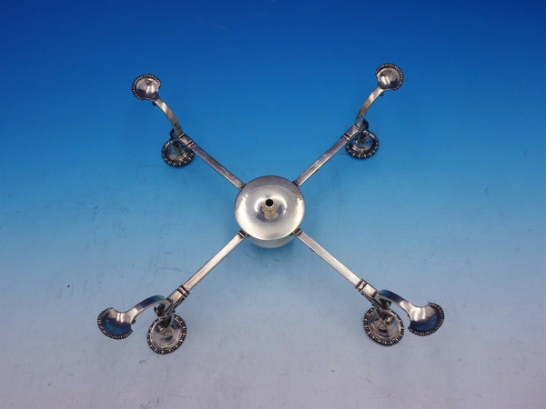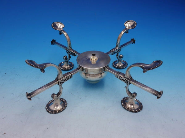 English Sterling-Georgian by EA silver adjustable expanding warmer stand with burner London 1759-71. It measures 3 3/4" x 13 1/4" x 13 1/4" and weighs 19.94 ozt. It is monogrammed (see photo) and is in good vintage condition. Outstanding piece!