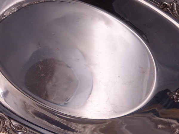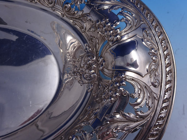 Outstanding Gorham #A9438 sterling silver pierced swing handle brides basket with basket of flowers design and pierced rim and handle. This piece measures 13 1/2" x 10" x 2 1/4" and weighs 33.8 troy ounces. It is monogrammed "MM" on the handle (see photos), and is in good vintage condition with minor dings in the bowl, as shown. Beautiful!