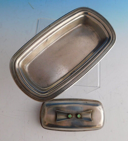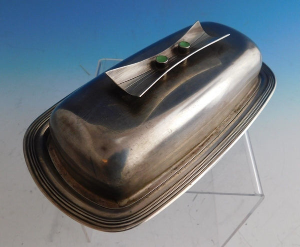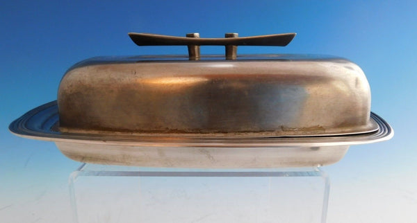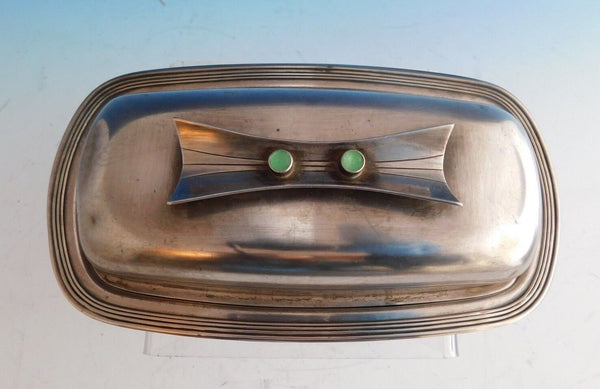 Jade Plain by Towle / Contempra House butter dish, covered. The top of the dish is sterling silver and made by Towle / Contempra House. The bottom is silverplate and made by Rogers Brothers. The dish is marked #53, and measures 7 1/2" x 4 1/4" x 2 3/8". This piece is not monogrammed and is in good vintage condition as shown in the photo. Marvelous!