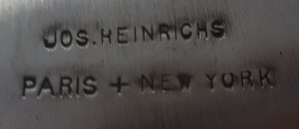 This copper and bronze lobster pot was made by Joseph Heinrichs. The piece has 3-D bronze lobsters with a copper and sterling pot and ebony finials and handle. It dates from about 1905 and it measures 9" tall and 10 1/2" wide. It is not monogrammed and is in excellent condition. Impressive! SKU#1096.