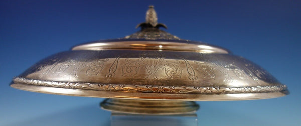 Gorgeous Orange Blossom by International sterling silver flower arranger with silverplate frog. The piece is marked #V75, measures 14" in diameter x 4 1/2", and weighs (without frog) 29.3 troy ounces. It is not monogrammed. This piece is in excellent condition with the silverplate top in good vintage condition with minor surface scratches as expected with age. Brilliant!