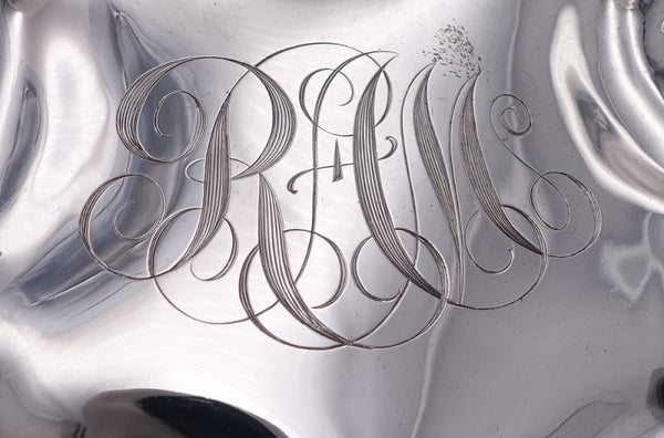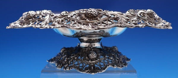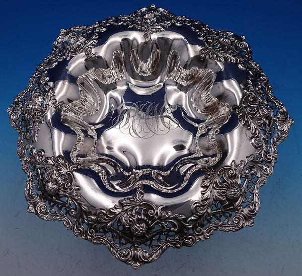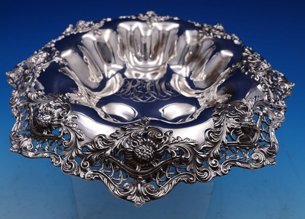 Gorgeous sterling silver compote with cast pierced chrysanthemums marked #3788 retailed by Bailey Banks and Biddle. This piece measures 10" and weighs 16.65 troy ounces. It is monogrammed in the center (see photos), and is in good estate condition. Stunning piece!