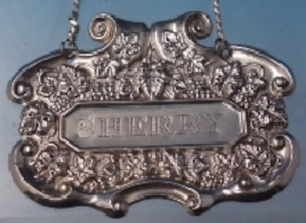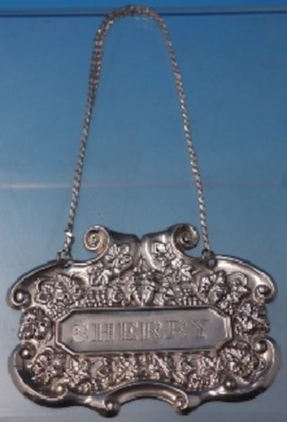 Exceptional sterling silver liquor label with grapes motif marked #351 (maker unknown). This piece measures 2 5/8" x 1 7/8" and weighs .66 troy ounces. It is engraved "Sherry" (see photos), and is in good estate condition. Wonderful!