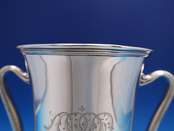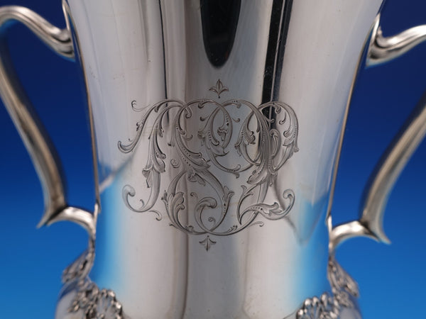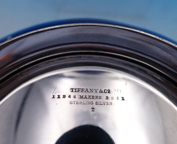 Lovely Wave Edge by Tiffany and Co sterling silver wine cooler with handles marked #11244/3241. This cooler holds 4 pints, measures 7 1/4" x 8", and weighs 24.34 troy ounces. It has a monogram on one side with an engraved date on the other (see photos), with inscription on the bottom that reads, "Harriet Louise Hush from Bertha R. Wells August 10th 1892". It is in good estate condition. Superb!