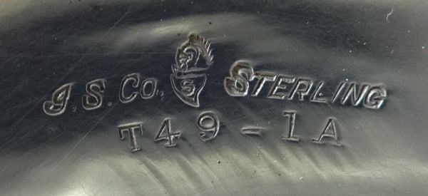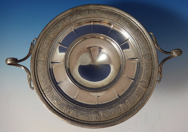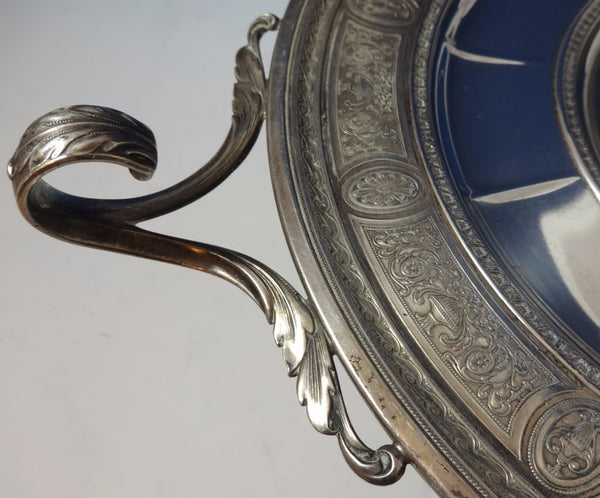 Wedgwood by International sterling silver cake stand on a pedestal base with applied handles. It is marked #T49-1A, measures 14 1/2" diameter x 6" tall, and it weighs 25.6 ozt. (not weighted). It is not monogrammed and is in excellent condition.