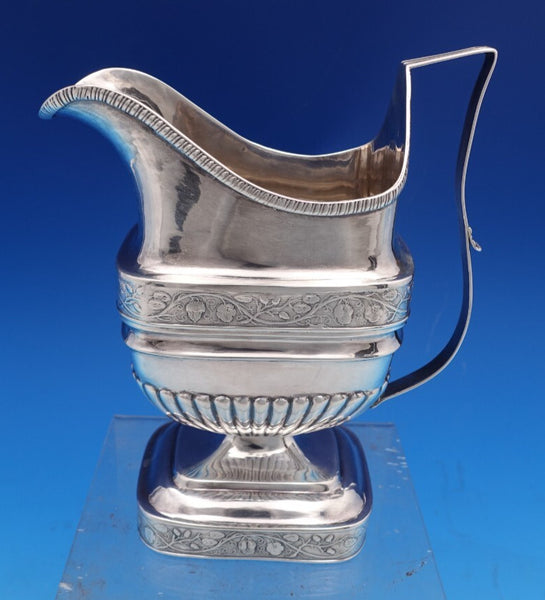 Gorgeous silver silver milk pitcher with gadroon edge and floral motif (unmarked/maker unknown). This pitcher measures 6 3/4" tall x 5 1/4" and weighs 7.6 troy ounces. It is not monogrammed and is in good estate condition as shown in the photos. Fantastic piece!