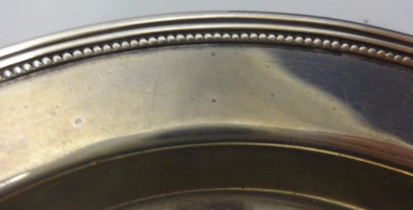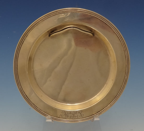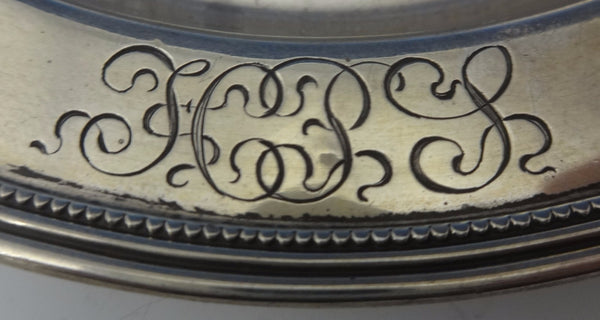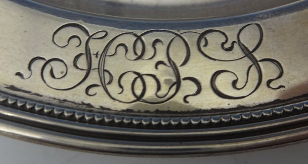 Simple Old Newbury by Towle sterling silver butter plate with attached butter knife rest. The piece has a "HCPL" monogram and it's marked with #5381. It dates from about 1910, and it measures 1/4" tall, 5 1/4" in diameter, and it weighs 3.1 ozt. It is in excellent condition.