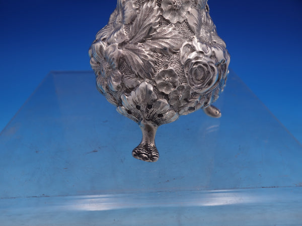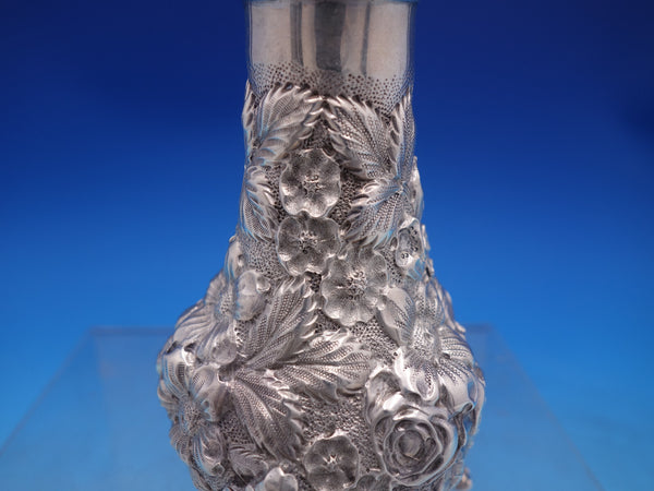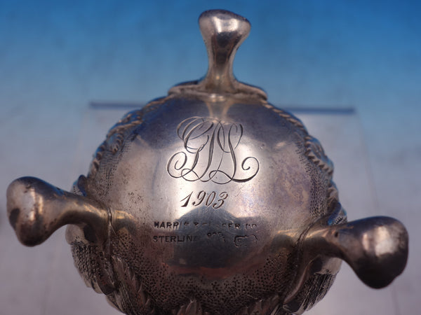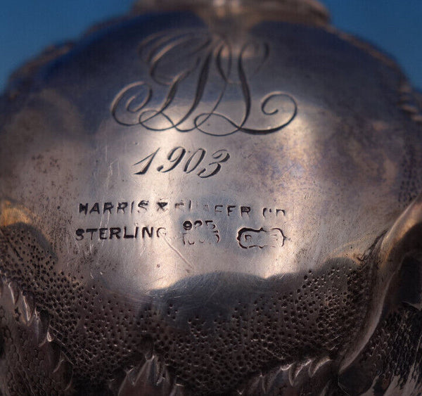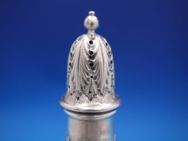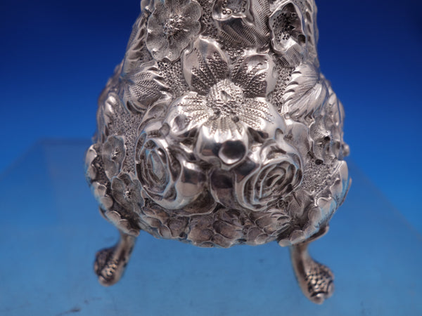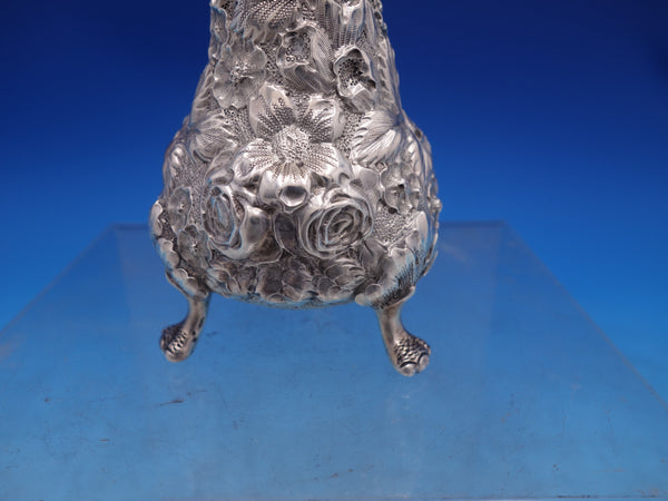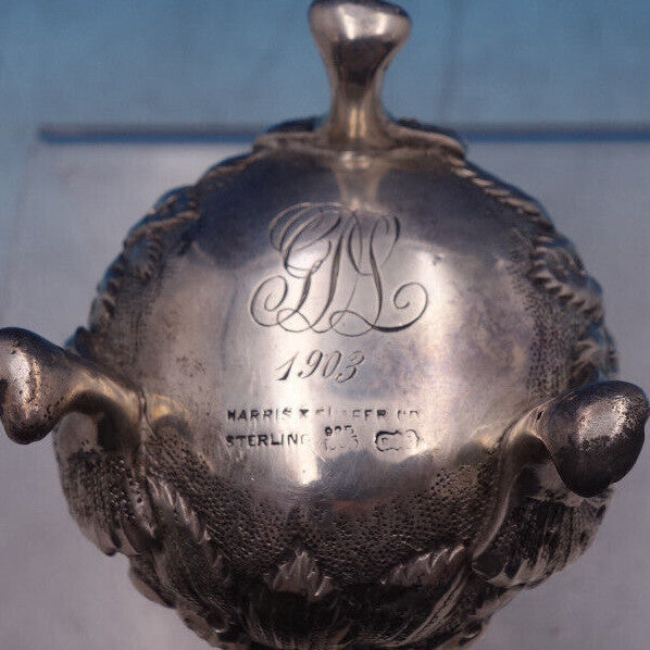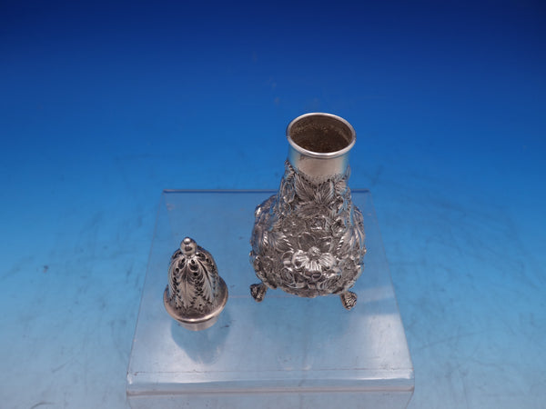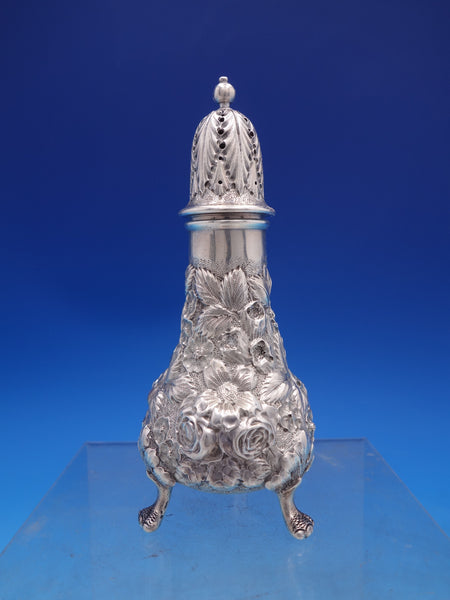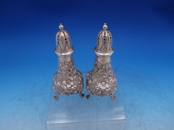 Repousse by Ritter Sullivan (Baltimore) sterling silver footed Salt and Pepper Shakers, Baltimore, dated 1903. They measure 5 1/4" tall and weigh 7 troy ounces total together. They are monogrammed in the center