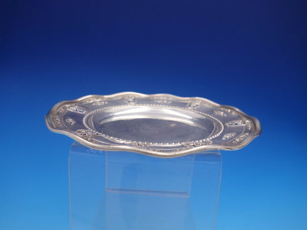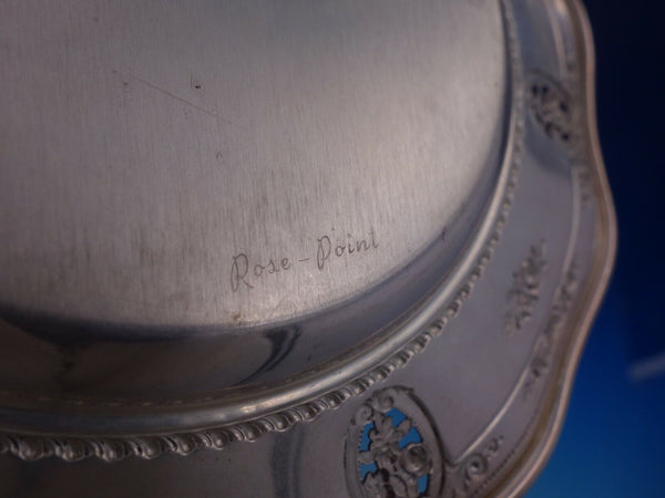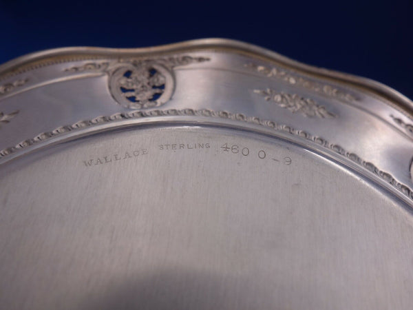 Rose Point by Wallace sterling silver dessert plate with wavy edge marked #4600-9. It measures 1/2" x 6 1/2" and weighs 4.4 ozt. It is not monogrammed and is in good vintage condition. Beautiful piece!
