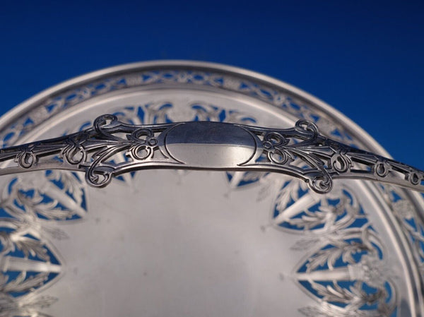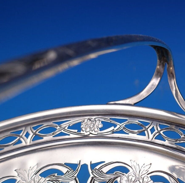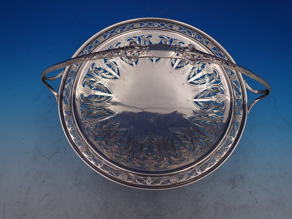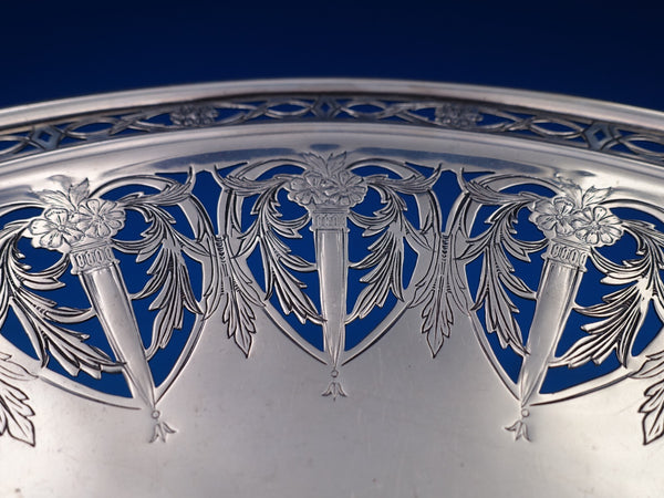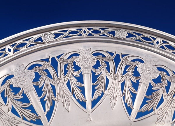 Beautiful Watson sterling silver footed cookie plate marked #6212. This plate is fancy pierced with engraved columns with flowers and leaves. It measures 5" tall (to handle) x 9 1/2" and weighs 11.28 troy ounces. It is not monogrammed and is in good estate condition as shown in the photos. Lovely!