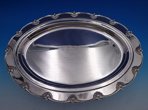 Stunning English King by Tiffany and Co sterling silver trophy platter marked #11742/146. This trophy platter has an inscription that reads, "New York Racing Association The Belmont Breeders' Cup Belmont Park September 16, 2000 Won by Arthur I. Appleton's Forbidden Apple" (see photos).
