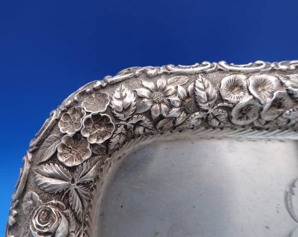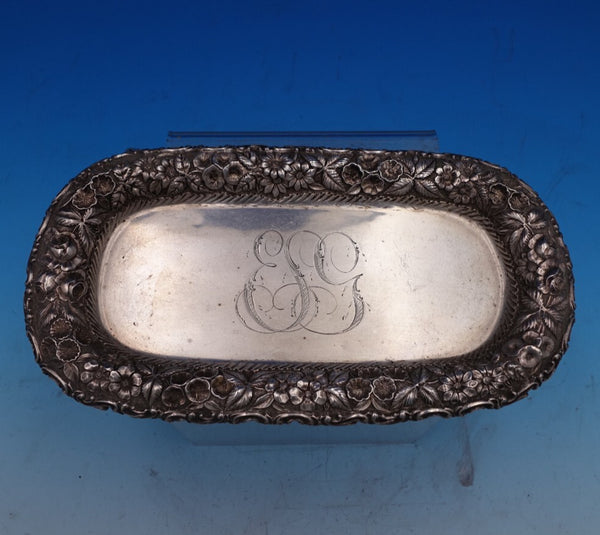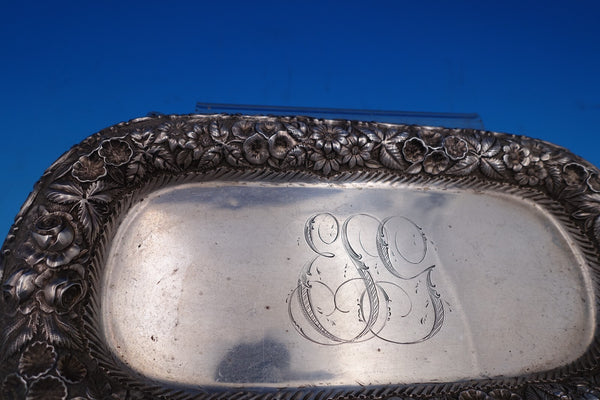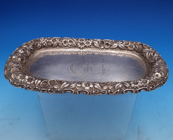Beautiful Repousse by Jacobi and Jenkins sterling silver business card tray. This tray measures 8 3/4" x 4 3/4" and weighs 6.6 troy ounces. It has a monogram in the center (see photos), and is in good estate condition as shown. Wonderful piece!