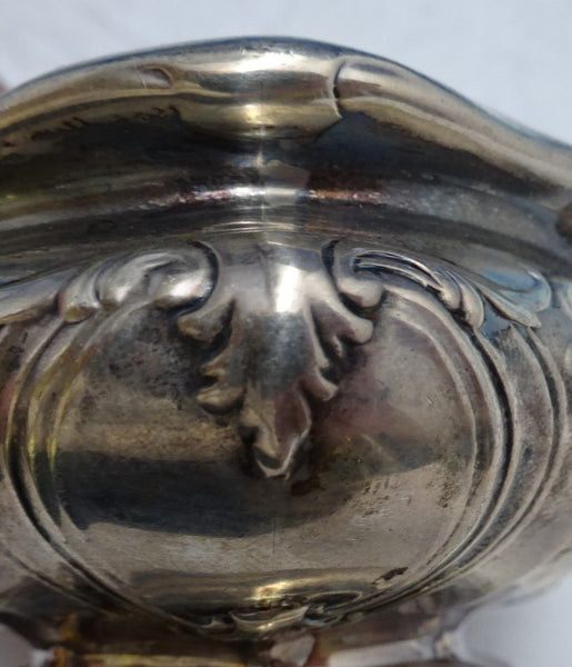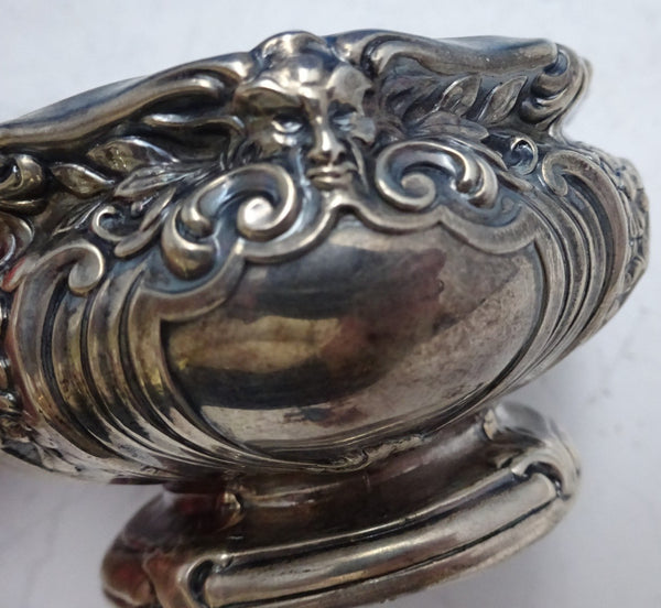 Outstanding Gorham sterling silver master salt dip pair with gold washed interiors and glass liners marked #A1016. The dips feature figural motif of face, Northwind, scrolls, plumes, and flowers.