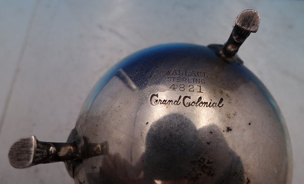 Lovely Grand Colonial by Wallace sterling silver salt dip with three feet marked #4821. This piece measures 3" x 2 1/2" x 1 7/8" and weighs 1.9 troy ounces. It is not monogrammed and is in good estate condition as shown in the photos. Charming!