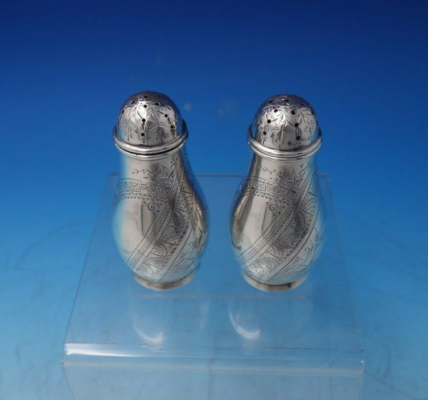 Superb Antique Rosette by Whiting sterling silver bright-cut salt and pepper shaker pair marked #30. The shakers measure 3 1/2" tall x 1 3/8" and together weigh 3.7 troy ounces. They are not monogrammed and are in good vintage condition. Wonderful!