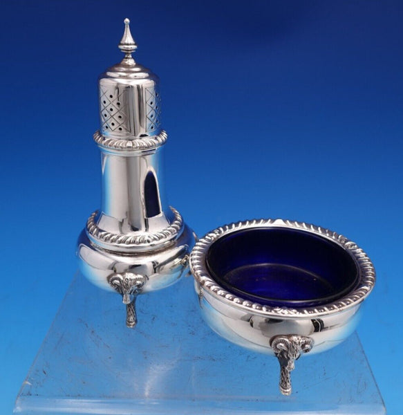 Superb George II by Frank Whiting reproduction sterling silver salt dip and pepper shaker two-piece set marked #836. This set features beautiful gadroon borders and ram feet and includes: