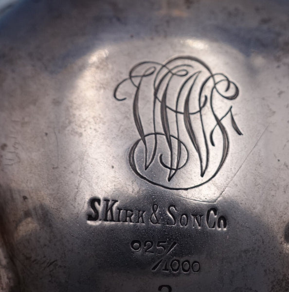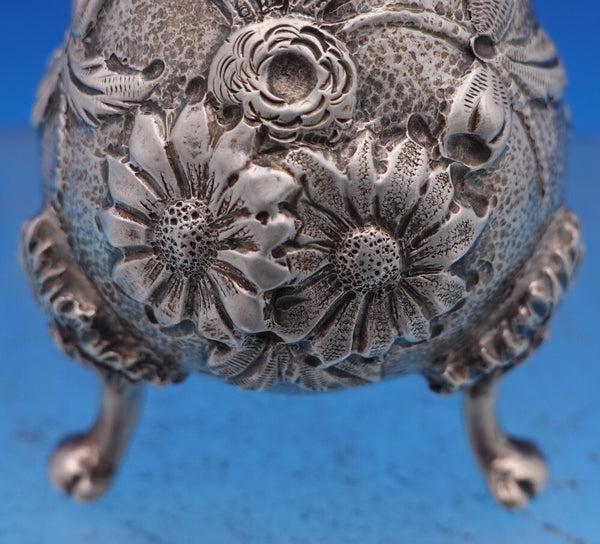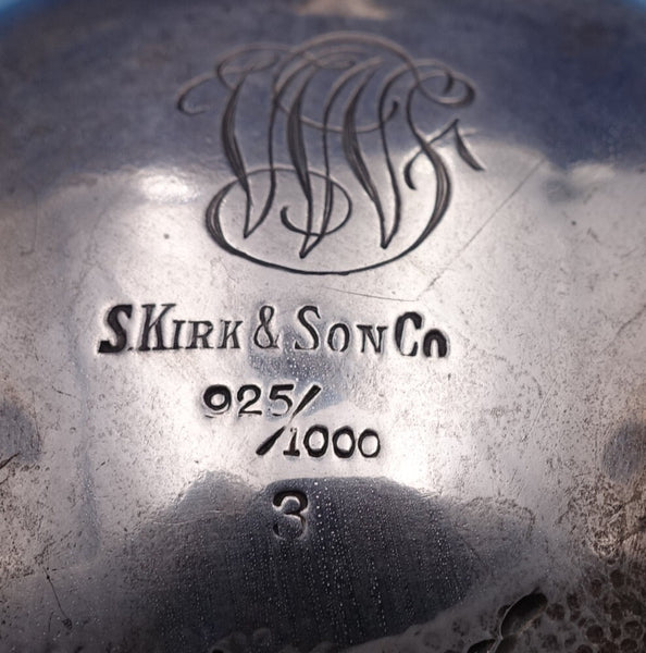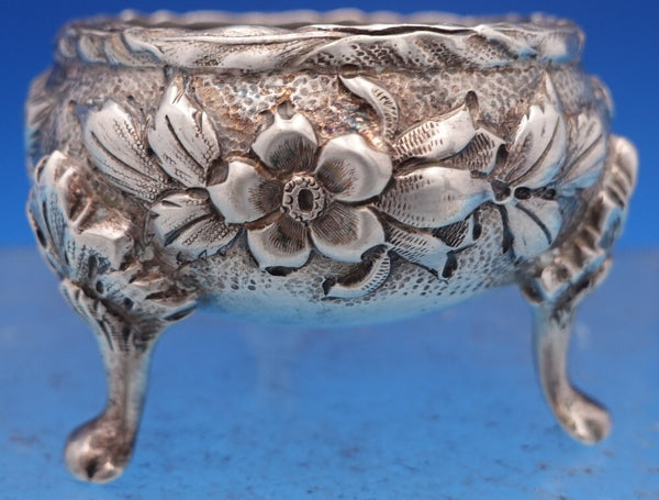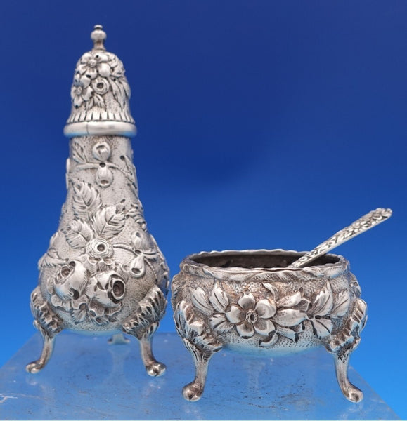 Repousse by Kirk sterling silver Salt and Pepper 3-piece set, weighing 6.2 ozt total, with 925/1000 mark c1896-1924. This set includes: