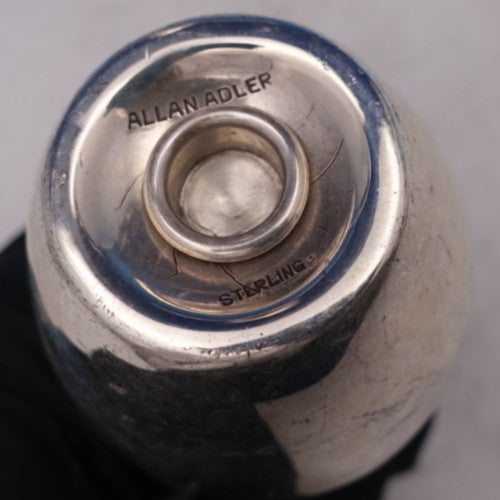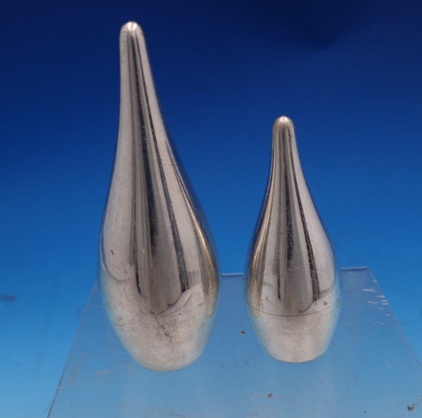 Captivating Starlit by Allan Adler sterling silver two-piece salt and pepper shaker pair. The salt shaker measures 4 1/2" (h) x 2" (w), and the pepper shaker measures 3 1/4" (h) x 1 1/4" (w). Together they weigh 3 troy ounces. The pieces are not monogrammed and are in good estate condition. Remarkable!
